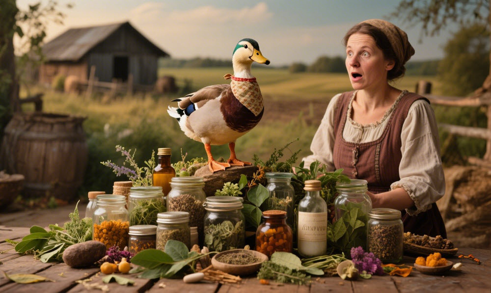 My only companion was a duck I named Quaky. I grew very fond of her, as I needed some comfort after my husband’s death. She was like a daughter to me. I fed her the best and spoke to her very often. I guess she must have understood me and learned over time. And then when I got ill, my duck suddenly came to me with some herbs in her beak and laid them into my palm. I ate them and the next day the fever was gone! I was amazed!